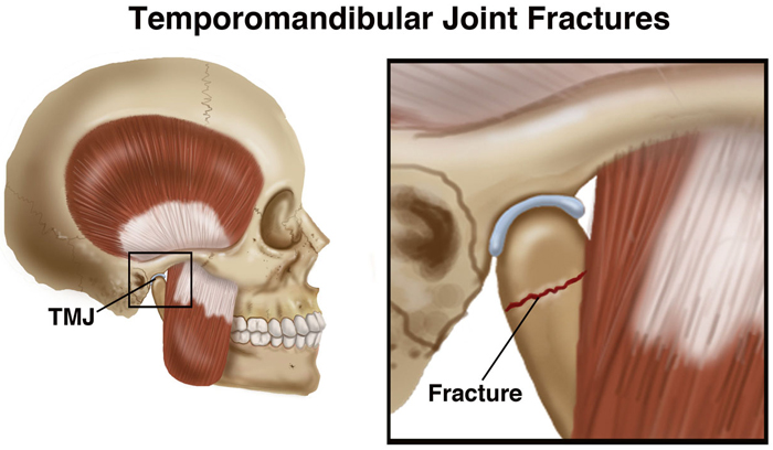 A temporomandibular joint (TMJ) facture happens when the mandible and/or temporal bone is suffers a breakage or fracture near or through the TMJ, which is the joint connecting the jaw bone to the skull.