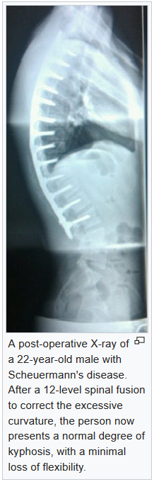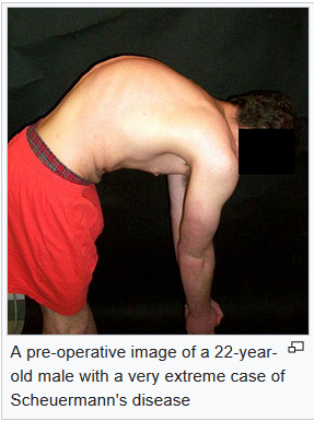 See our thoracic spine has a normal slight bend (medically termed as "kyphosis") but in Scheuermann's Kyphosis, it's much more (see image above). It refers to a condition that tends to happen moreso in one's adolescent (teenage) years, usually at the end of the growth years/age.